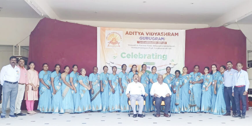 The Republic Day celebration at Aditya Vidyashram Gurugram Coimbatore was a vibrant event. The Principal hoisted the national flag, and the Founder Sir addressed the gathering. Students showcased their talents in cultural programs, including dances and speeches. The little students dressed up as freedom fighters, adding a patriotic touch. The program concluded with the distribution of sweets, acknowledging the teachers’ efforts in training the students.